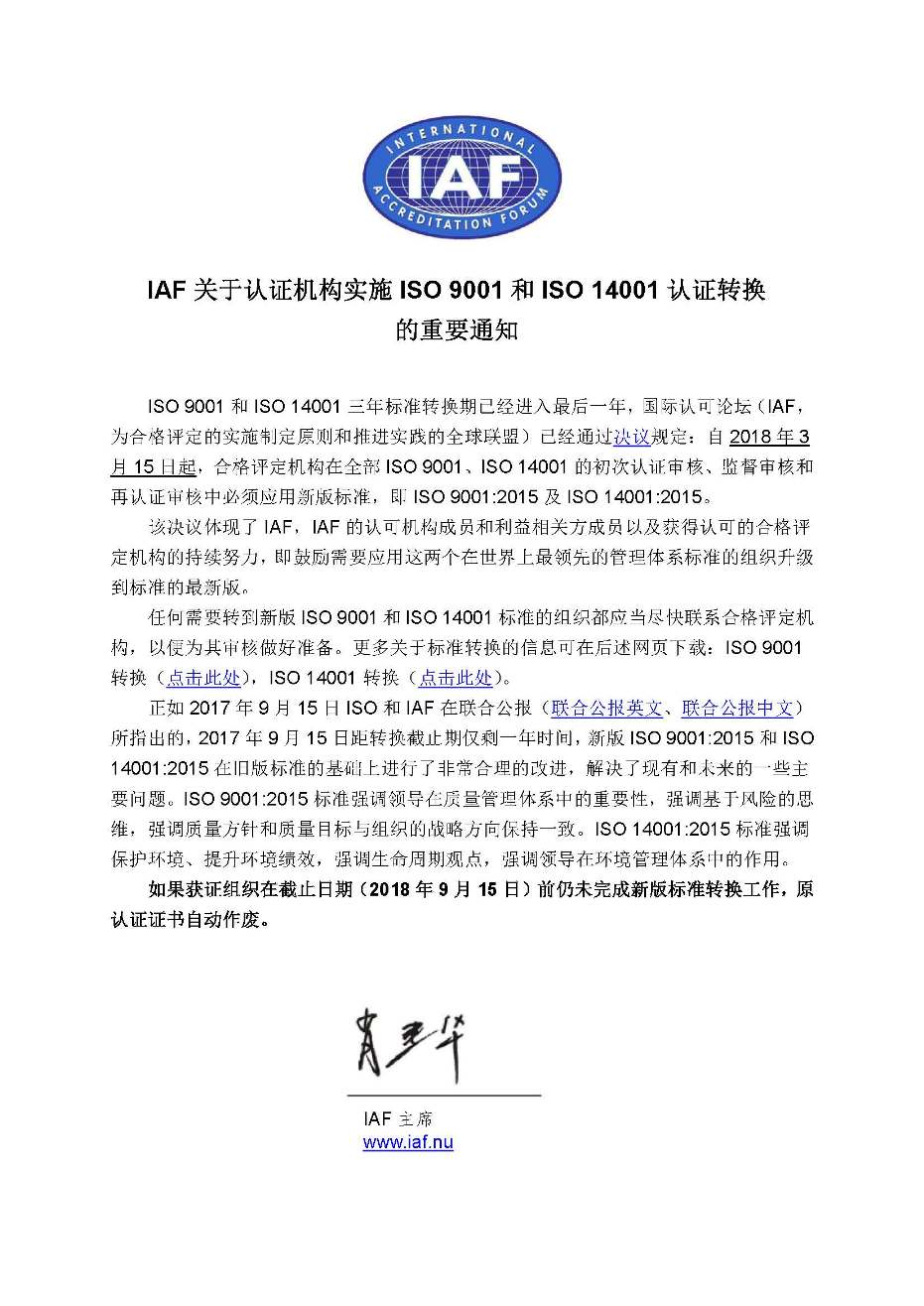 IAF关于认证机构实施ISO 9001和ISO 14001认证转换的重要通知